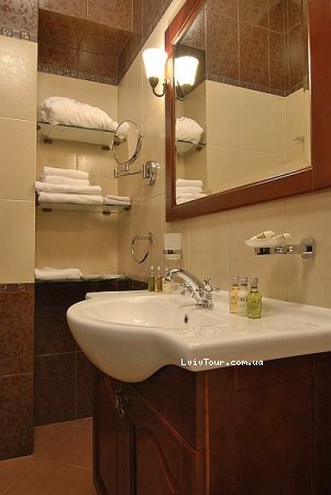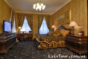 Посольский Люкс - 1800 грн Дорогой и изысканный номер, где множество золотистой отделки, удобной качественной мебели и истинного комфорта. Двуспальная кровать, телевизор с кабельным телевидением, телефон. В ванной комнате – душевая кабинка, фен, набор мини-косметики, банные принадлежности.