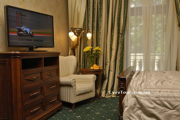 Люкс Премиум - 2000 грн Двухкомнатный номер, для истинных аристократов, где соединилась строгость стиля и роскошь декора. В номере: двуспальная кровать, телевизор с кабельным телевидением, телефон, сейф. В ванной комнате – душевая кабинка, фен, набор мини-косметики, банные принадлежности.